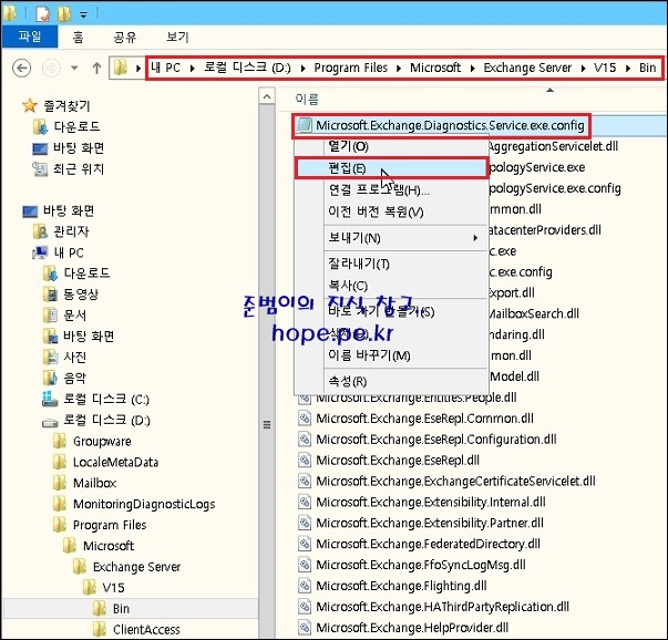 Exchange Server가 설치된 경로로 이동합니다. 그리고 'Microsoft.Exchange.Diagnostics.Service.exe.config' 파일에서 우클릭후 '편집' 을 클릭 합니다.