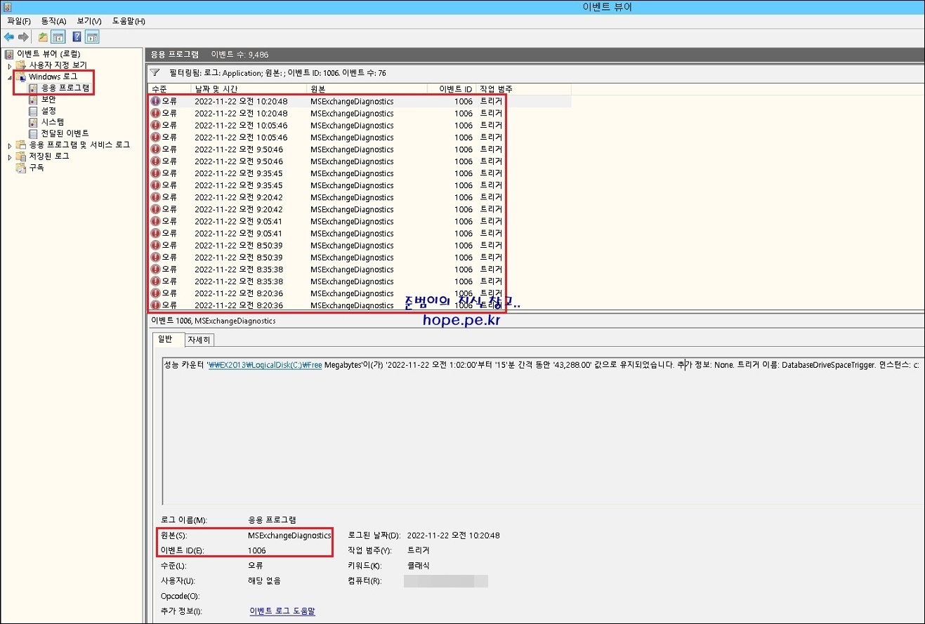 Exchange Server 2013 or 2016 을 운영하다 보면 특정 시점에 'Windows 로그 > 응용 프로그램' 로그에 'Event ID 1006, 원본 MSExchangeDiagnostics' 가 15분 간격으로 지속적으로 발생하는 경우가 있을 수 있습니다.