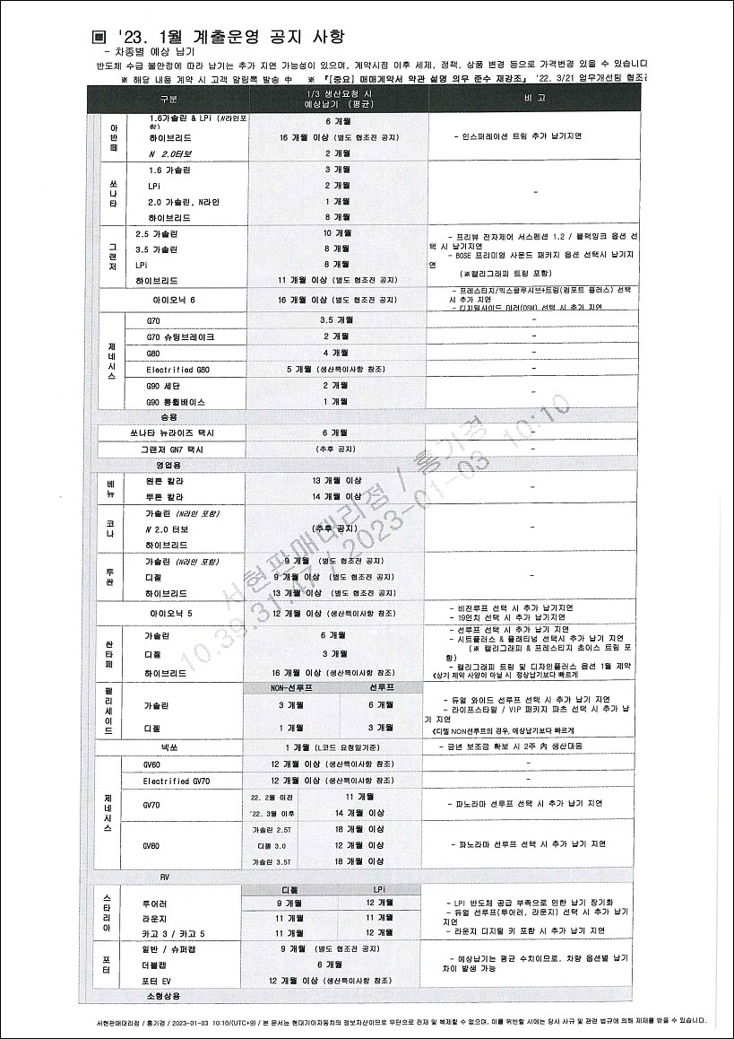 계약 과정중에 얻게된 '2023년01월 현대자동차 & 제네시스 출고 기간' 정보를 공유 드립니다.