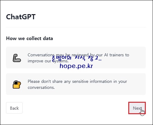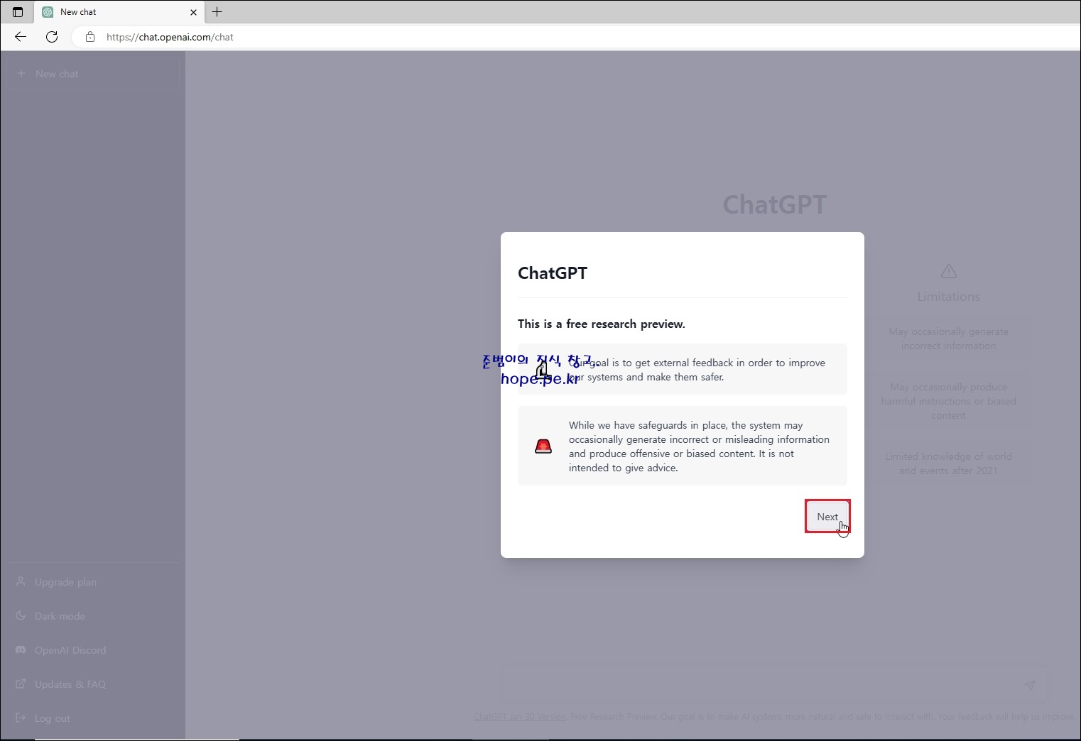 This is a free research preview. 화면에서, 'Next' 를 클릭 합니다.