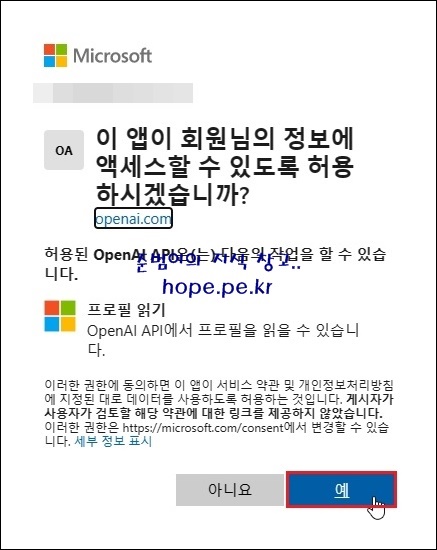 이 앱이 회원님의 정보에 액세스할 수 있도록 허용하시겠습니까? 화면에서, 허용된 API가 어떤 작업을 하는지 정독후 '예' 를 클릭 합니다.