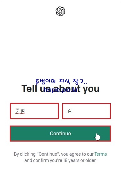 Tell us about you 화면에서, '이름 및 성' 입력 후 'Contine' 를 클릭 합니다.