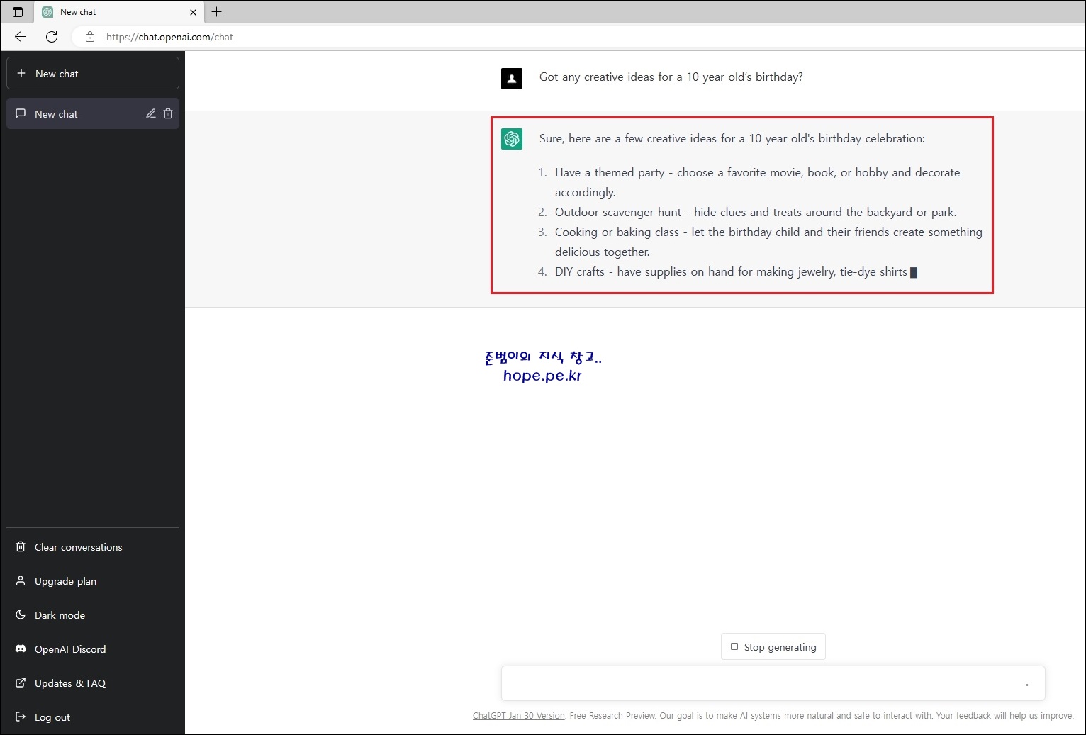 cf) 'Stop generating' 버튼을 클릭해 답변 생성을 중지할 수도 있어 보입니다.