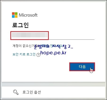 로그인 화면에서, 보유한 'Microsoft 계정' 입력후 '다음' 을 클릭 합니다.