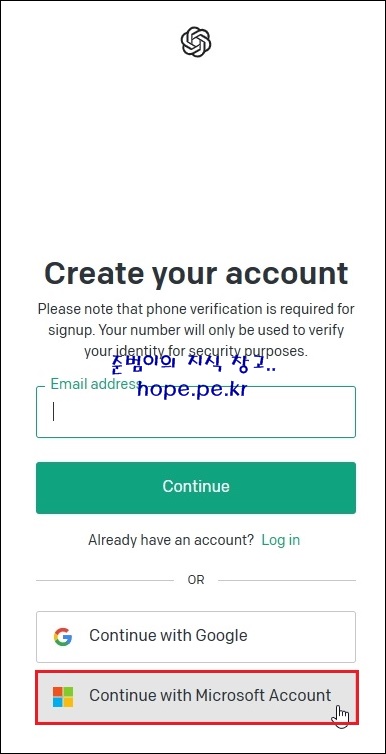 Create your account 화면에서, 'Continue with Microsoft Account' 를 클릭 합니다.