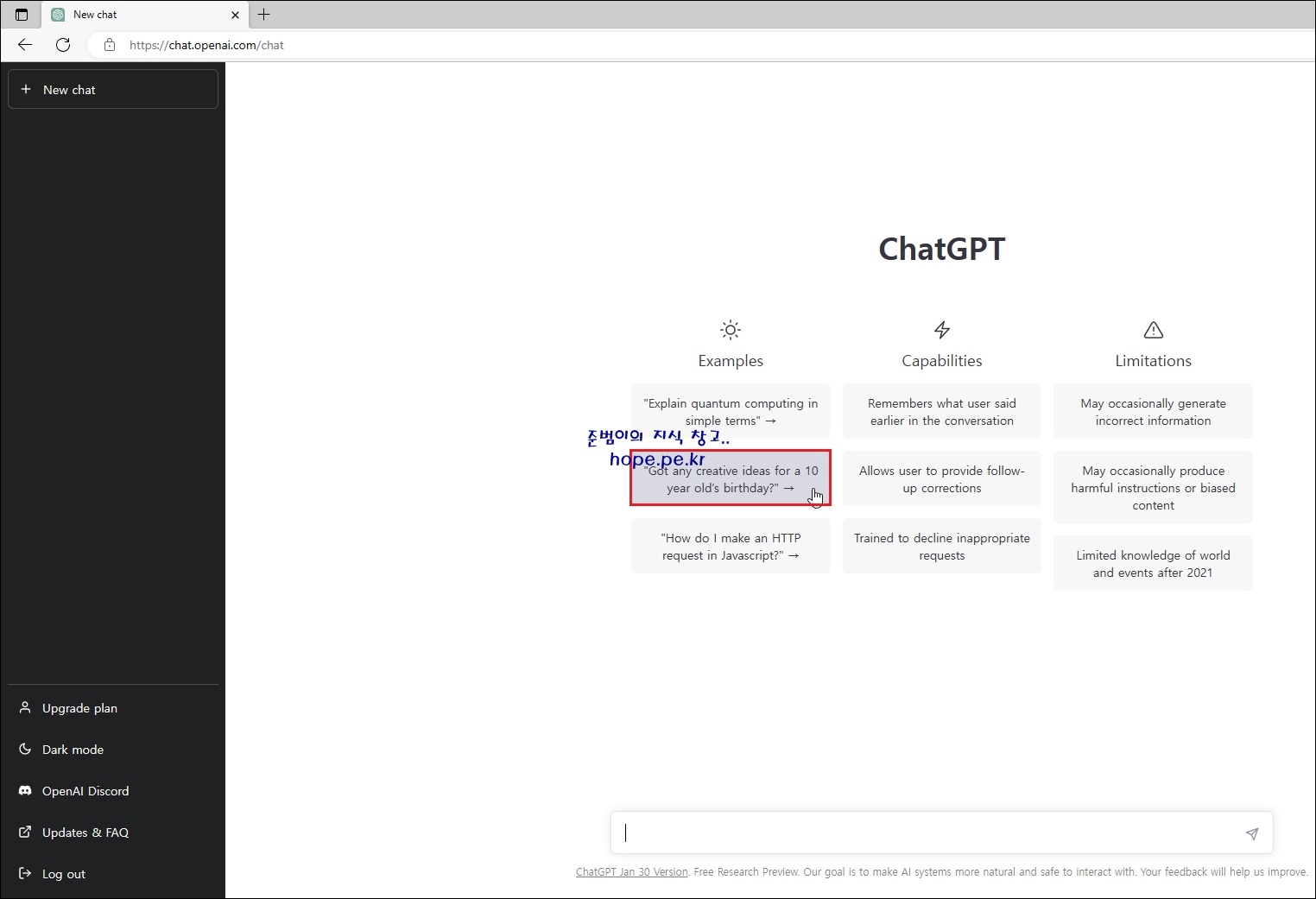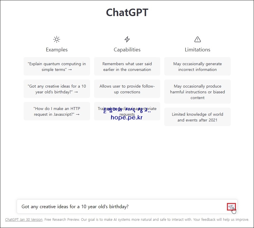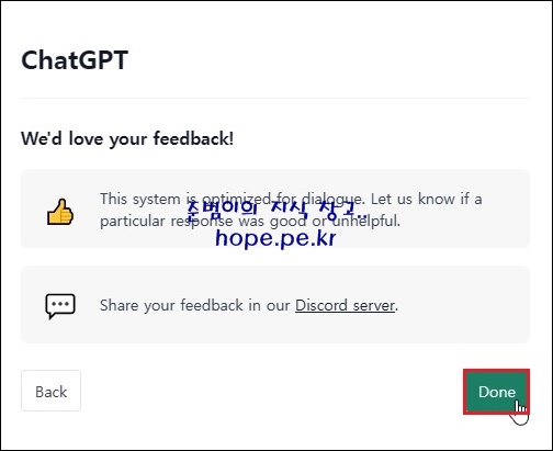 회원 가입이 완료되면, ChatGPT를 사용하기 위한 간단한 안내창이 발생 합니다.