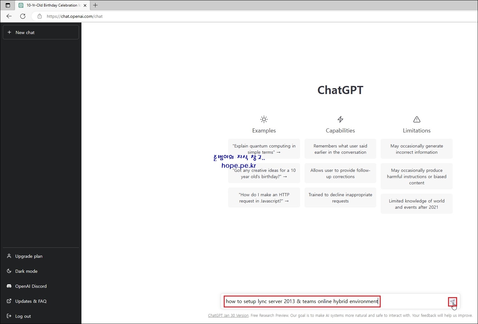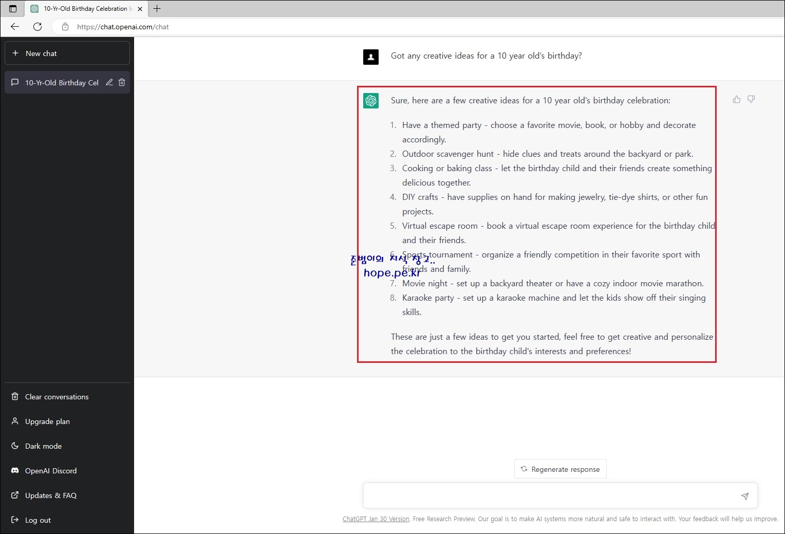 먼저 'Examples' 에 있는 예제 하나를 테스트로 클릭해보겠습니다. "Got any create ideas for a 10 year old's birthday?" 를 클릭 합니다.