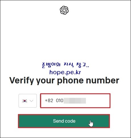 Verify your phone number 화면에서, '핸드폰 번호' 입력후 'Send code'를 클릭 합니다.