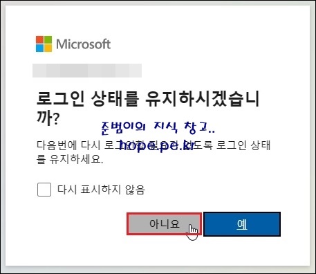 로그인 상태를 유지하시겠습니까? 화면에서, 로그인 유지 여부를 선택하면 됩니다. 저는 '아니요' 를 클릭 했습니다.