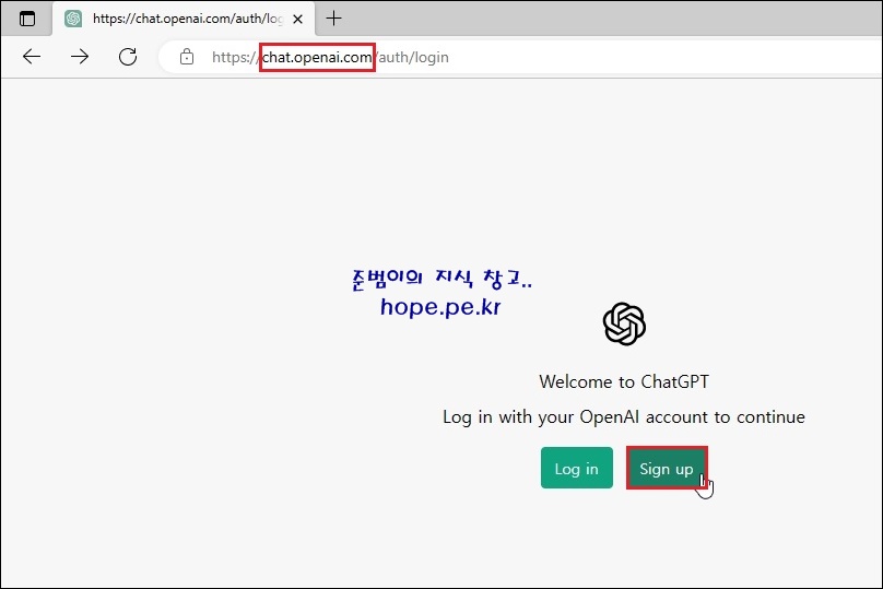 ChatGPT 사이트(https://chat.openai.com)에 접속후, 'Sign up' 을 클릭 합니다.