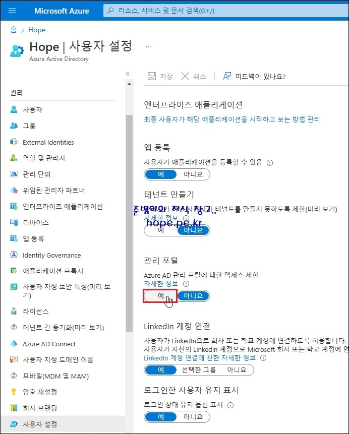 '관리 포털: Azure AD 관리 포털에 대한 액세스 제한' 의 '예' 를 클릭 합니다.
