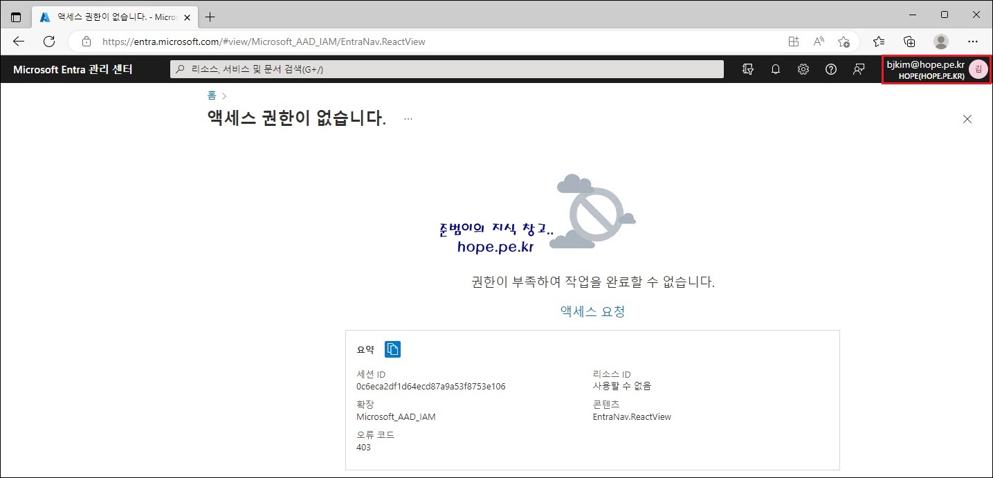 'Microsoft Entra 관리 센터' 접속 역시, '권한이 부족하여 작업을 완료할 수 없습니다.' 메세지가 표시되며 접속이 제한됩니다.