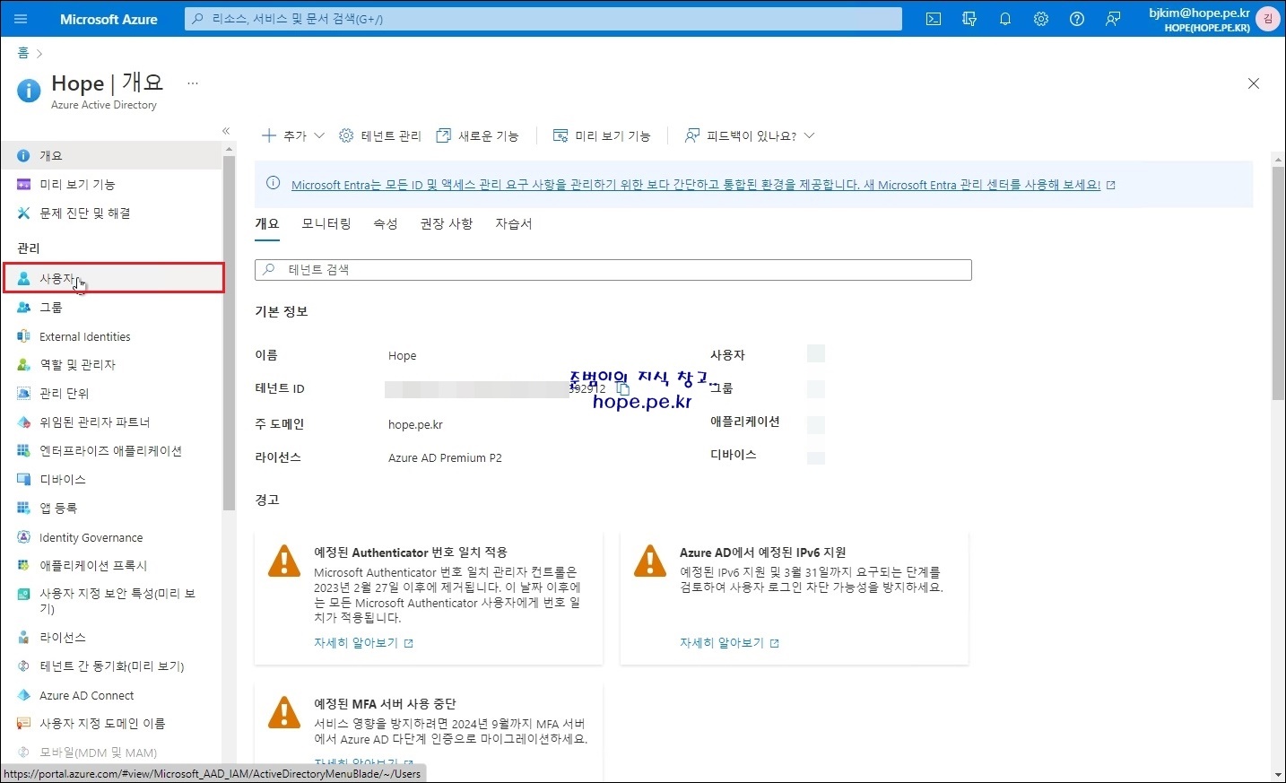 'Microsoft Entra 관리 센터' 역시 접속이 가능합니다. 관리 센터 내 설정들을 확인 할 수는 있지만, 변경 및 삭제 등의 작업은 할 수 없습니다.