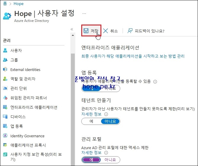 하지만, 굳이 일반 사용자가 'Azure Active Directory 관리 사이트' 및 'Microsoft Entra 관리 센터' 에 접속을 가능하게 설정할 필요도 없어 보입니다. 보안상 제한 설정을 하는것이 권장 사항으로 생각됩니다.