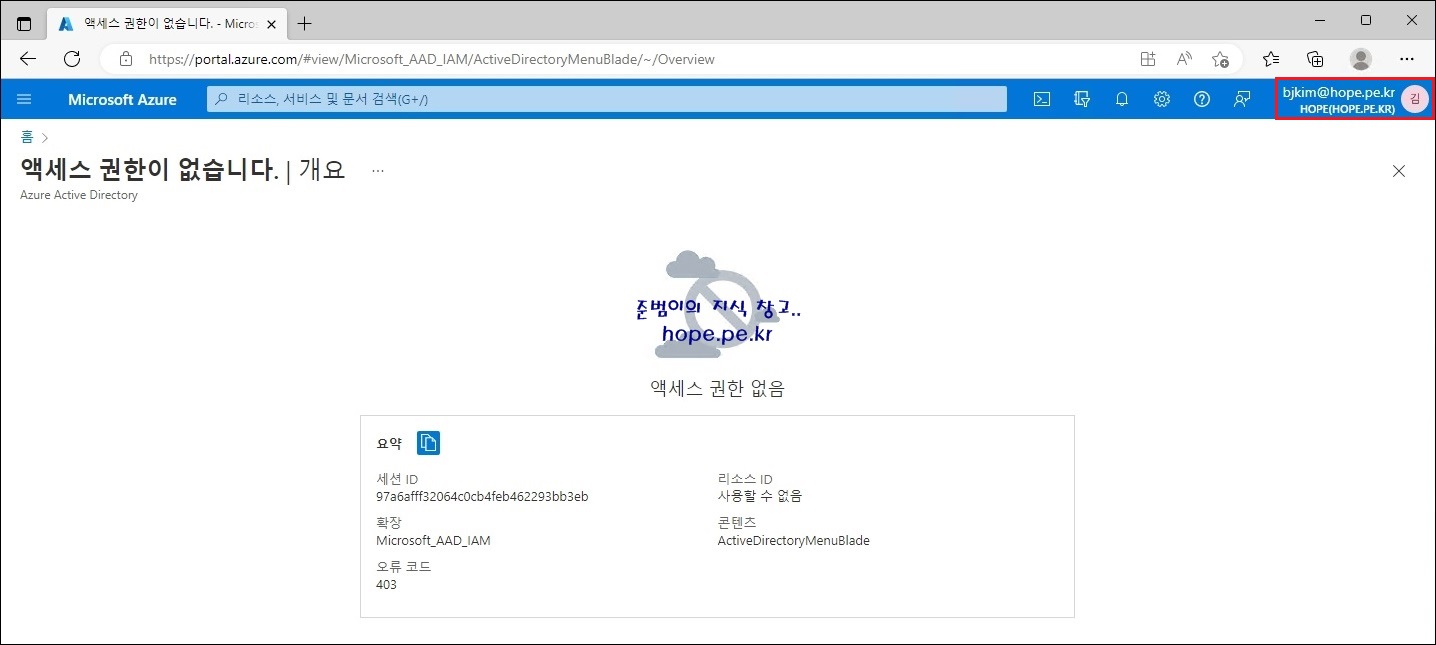 'Azure Active Directory 관리 사이트' 접속시, '액세스 권한 없음' 메세지가 표시되며 접속이 제한됩니다.
