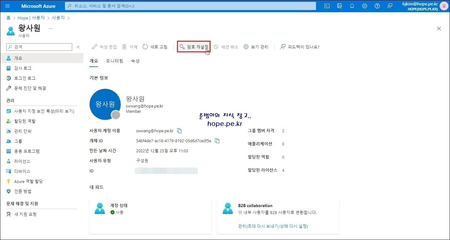 특정 사용자에 대한 자세한 정보를 확인할 수 있습니다. '암호 재설정' 메뉴가 활성화 되어 있네요? 클릭해보겠습니다.
