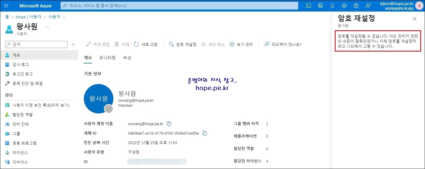 특정 사용자에 대한 자세한 정보를 확인할 수 있습니다. '암호 재설정' 메뉴가 활성화 되어 있네요? 클릭해보겠습니다.