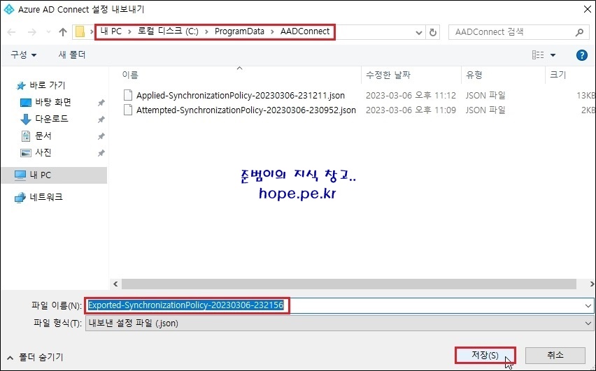 Azure AD Connect 설정 내보내기 창에서, ‘경로(C:\ProgramDate\AADConnect)와 파일 이름’을 메모 후 ‘저장’ 을 클릭합니다. Cf) 원하는 위치로 설정 파일을 내보내도 됩니다.