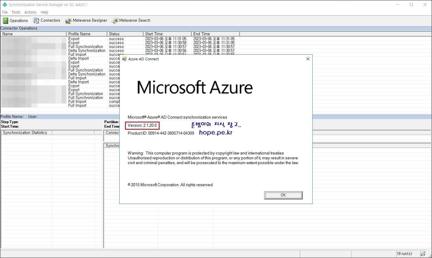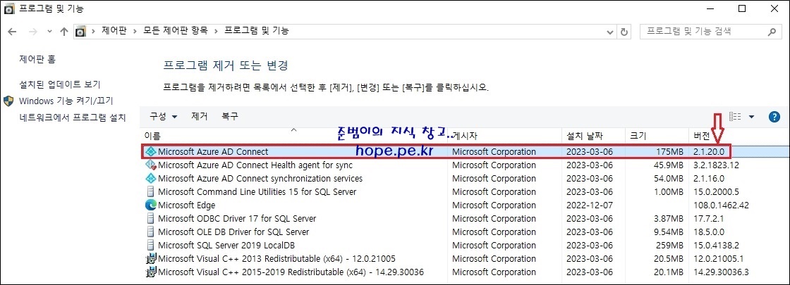 Cf) 이때 제어판을 확인해보면, Microsoft Azure AD Connect의 버전은 벌써 최신 버전인 2.1.20.0 으로 표시됩니다.