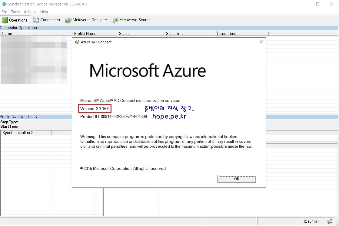 먼저 Azure AD Connect 버전을 확인해보겠습니다. 자동 업그레이드를 지원하는 최신 버전인 2.1.16.0 버전 입니다.