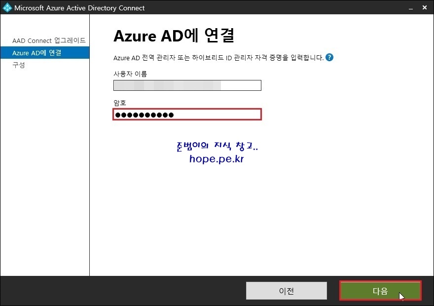 Azure AD에 연결 화면에서, Azure AD 전역 관리자의 ‘암호’ 입력 후 ‘다음’을 클릭합니다.
