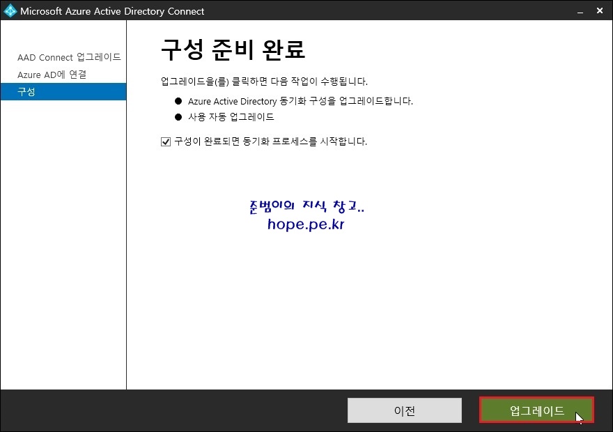 Microsoft Azure Active Directory Connect 창의 Azure Active Directory Connect 업그레이드 화면에서, ‘업그레이드’를 클릭합니다.
