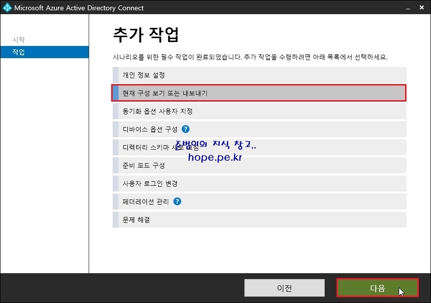 추가 작업 화면에서, ‘현재 구성 보기 또는 내보내기’ 클릭 후 ‘다음’을 클릭합니다.