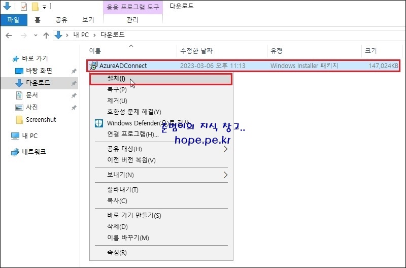 다운로드 받은 최신 'AzureADConnect.msi' 파일을 실행합니다.