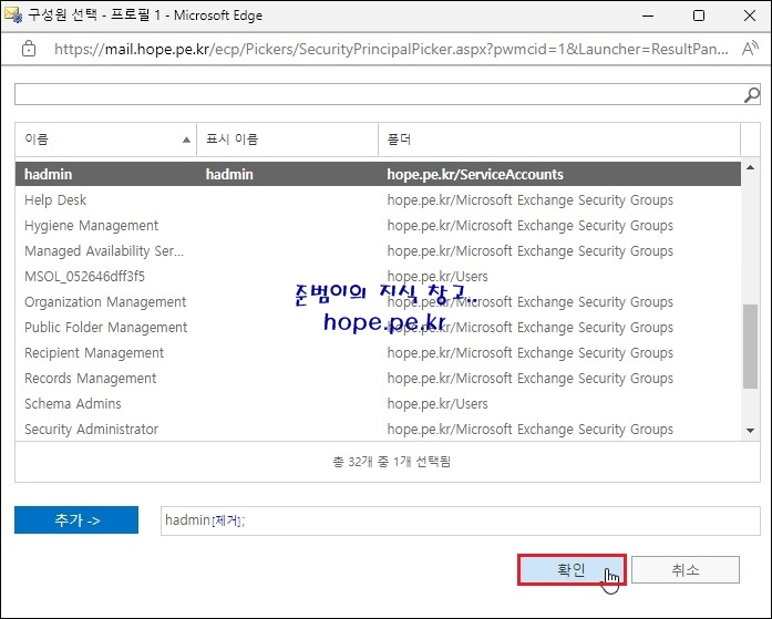 구성원 선택 - 프로필1 창에서, 'Exchange Server 관리자' 클릭 후 '추가' 를 클릭 합니다.
