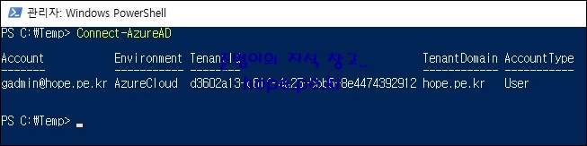 정상적으로 Azure AD에 PowerShell이 연결되었음을 확인합니다.