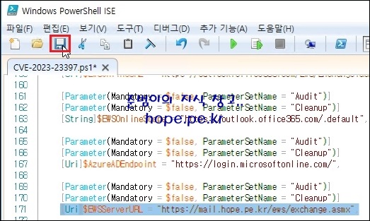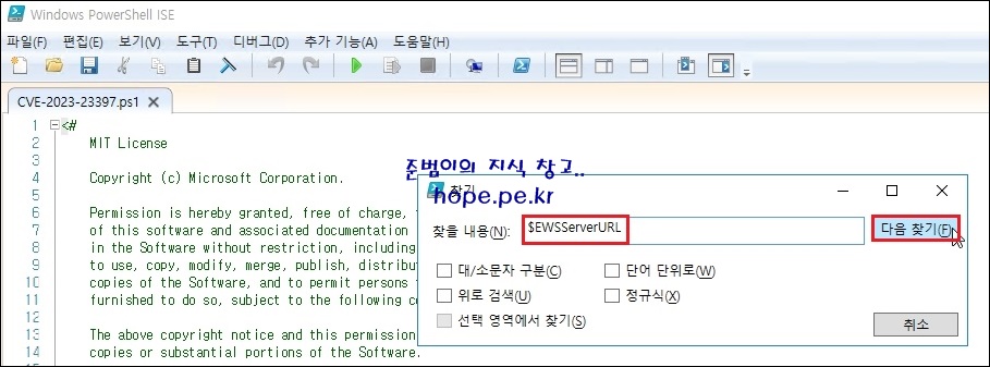 Windows PowerShell ISE 창에서, Ctrl + F Key를 눌러 찾기 창을 실행 후 '$EWSServerURL' 입력 후 '다음 찾기' 를 클릭 합니다.