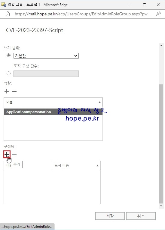 역할 그룹 - 프로필1 창에서, 구성원 항목의 '추가' 를 클릭 합니다.