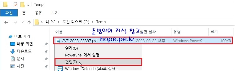 첫번째 단계에서 설명 드렸던 CVE-2023-23397.ps1 스크립트 파일을 동일하게 'C:\Temp' 폴더에 저장 합니다. 그리고 우클릭 후 '편집' 을 클릭 합니다.
