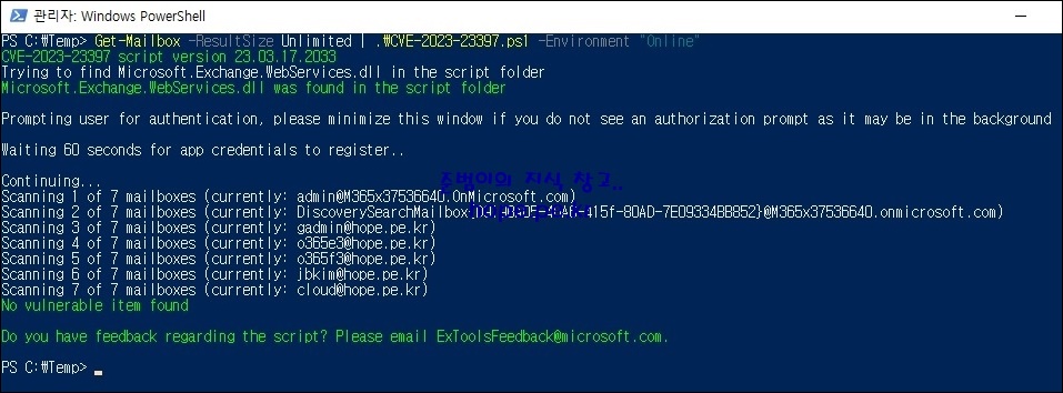 첫번째 Microsoft 365에서 CVE-2023-23397 script 파일 사용과 동일하게 'No vulnerable item found' 메세지가 발생하면, 취약한 항목을 발견하지 못한것이며 별다른 추가 조치가 필요하지 않습니다.