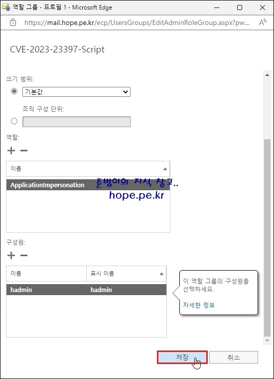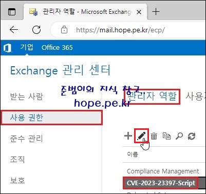 'Exchange 관리 센터 > 사용 권한 > 관리자 역할' 에서, 생성된 'CVE-2023023397-Script' 관리 역할 그룹 클릭 후 '편집' 을 클릭 합니다.