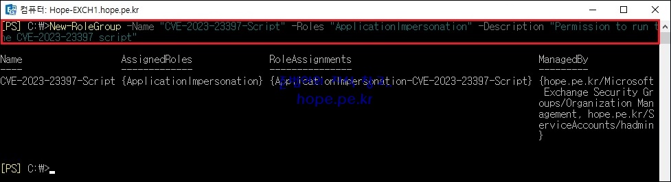 New-RoleGroup -Name "CVE-2023-23397-Script" -Roles "ApplicationImpersonation" -Description "Permission to run the CVE-2023-23397 script"