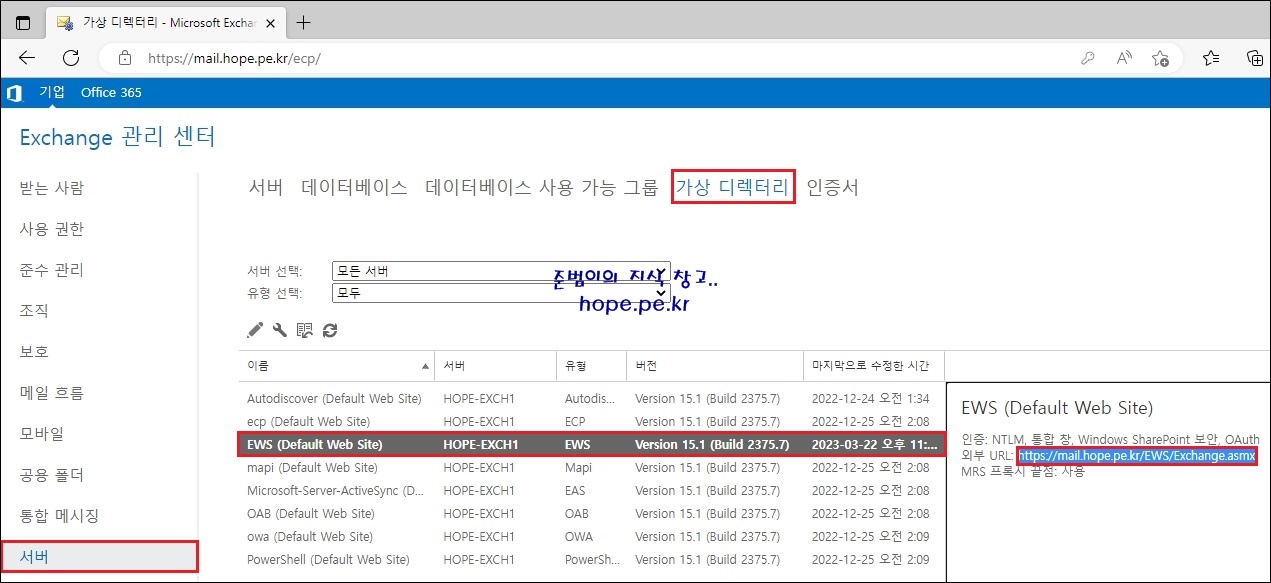 'Exchange 관리 센터 > 서버 > 가상 디렉터리' 에서, 'EWS (Default Web Site)' 클릭 후 '외부 URL' 을 복사 합니다.
