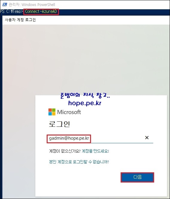 다음 cmdlet을 실행 후 사용자 계정 로그인 창에서, 'Azure AD 관리자 계정' 입력 후 '다음' 을 클릭 합니다.