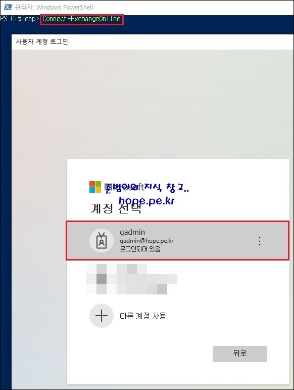 다음 cmdlet을 실행 후 사용자 계정 로그인 창에서, 로그인되어 있는 'Azure AD 관리자 계정' 을 클릭 합니다.