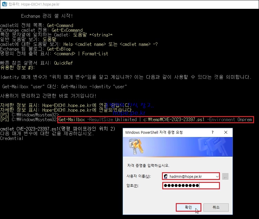Windows PowerShell 자격 증명 요청 창이 발생하면, 위 '2) 관리 역할 그룹에 구성원 추가' 단계에서 추가한 구성원의 계정 정보를 입력 후 확인을 클릭하면, 전체 사서함 감사가 실행 됩니다.
