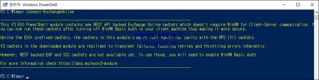 정상적으로 Exchange online에 PowerShell이 연결되었음을 확인합니다.