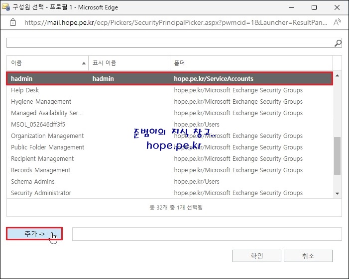 구성원 선택 - 프로필1 창에서, 'Exchange Server 관리자' 클릭 후 '추가' 를 클릭 합니다.