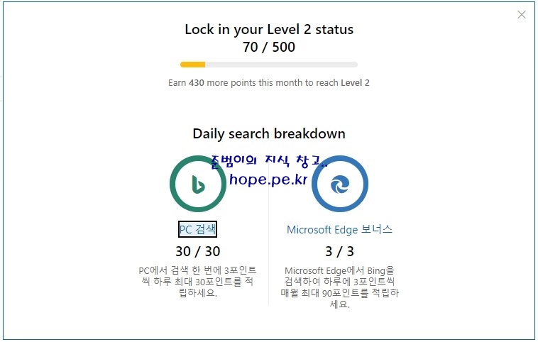 참고로 Level 2의 Bing 검색 혜택은 PC 150포인트 + 모바일 100포인트 입니다. PC뿐 아니라 모바일에서도 열심히 검색을 해야겠네요;;