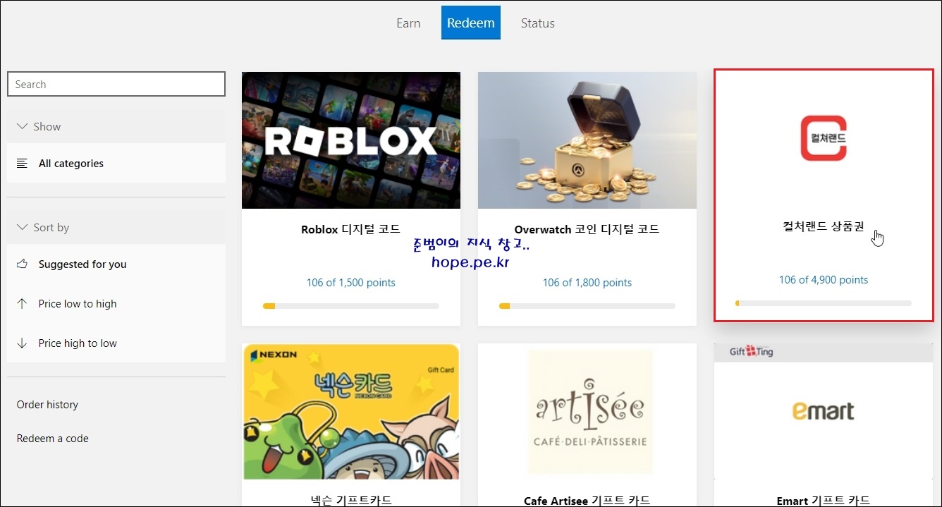 Redeem에서 포인트를 상품으로 교환할 수 있습니다.