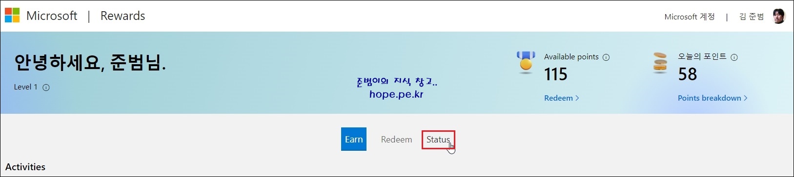 모든 Activities 항목들을 클릭해서 포인트를 적립해 줍시다! Activities 항목이 많지 않아서 아쉽네요.