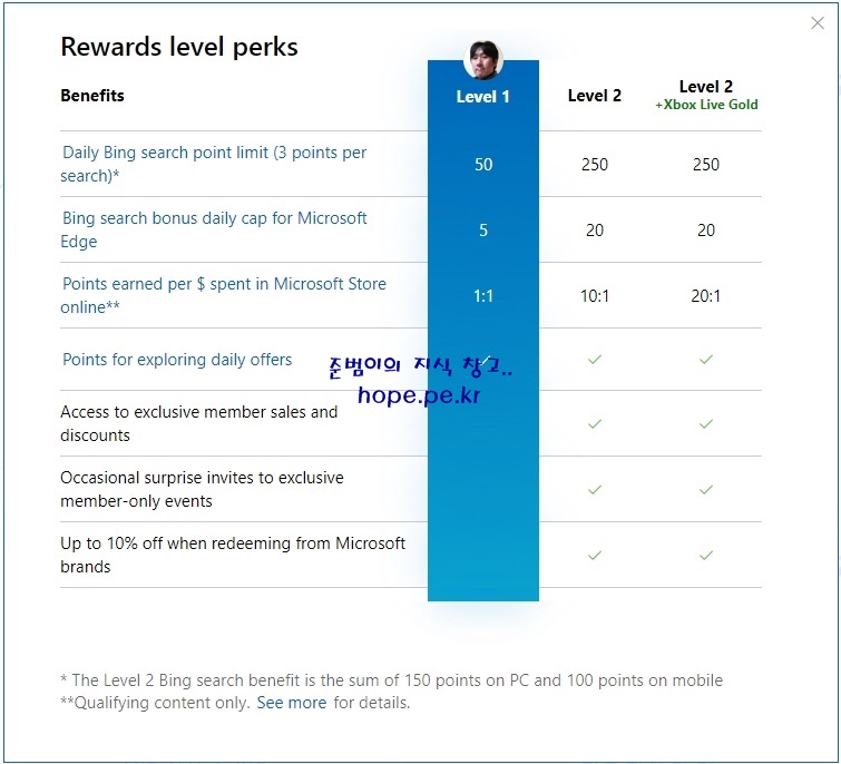 참고로 Level 2의 Bing 검색 혜택은 PC 150포인트 + 모바일 100포인트 입니다. PC뿐 아니라 모바일에서도 열심히 검색을 해야겠네요;;