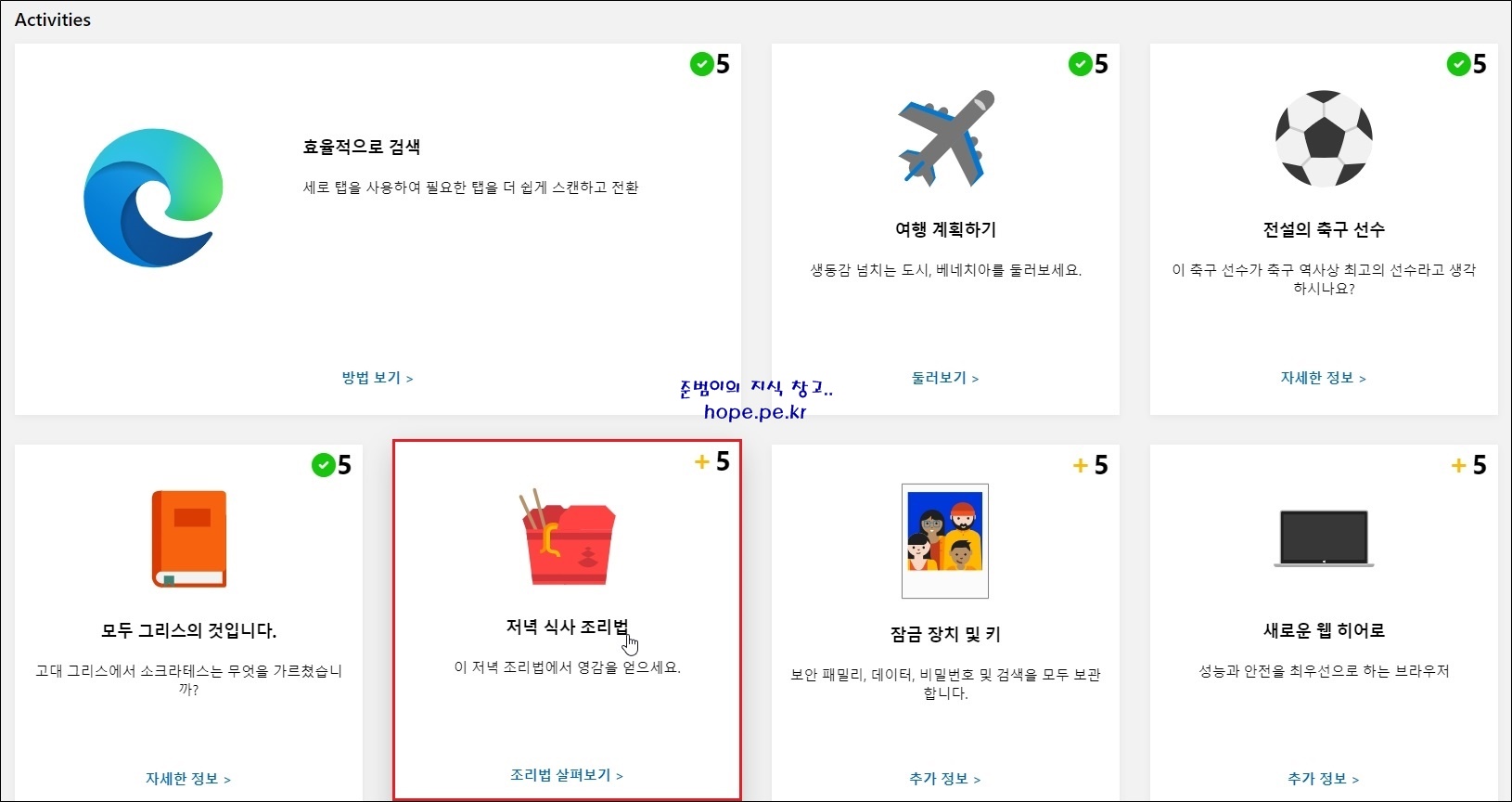 Activities는 항목들을 클릭해서 항목당 5포인트를 적립할 수 있습니다.