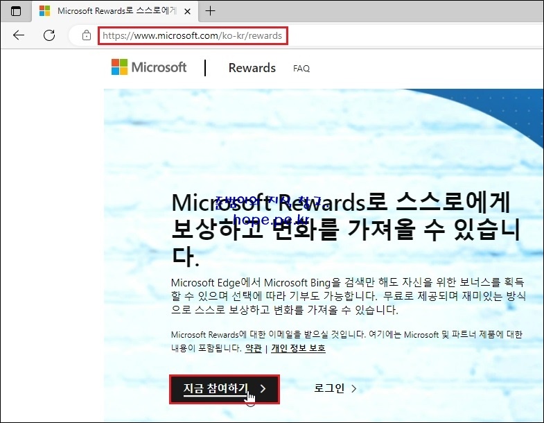 Microsoft Edge 브라우저 실행하여, Microsoft Rewards 사이트(https://www.microsoft.com/ko-kr/rewards)에 접속 후 '지금 참여하기'를 클릭합니다.