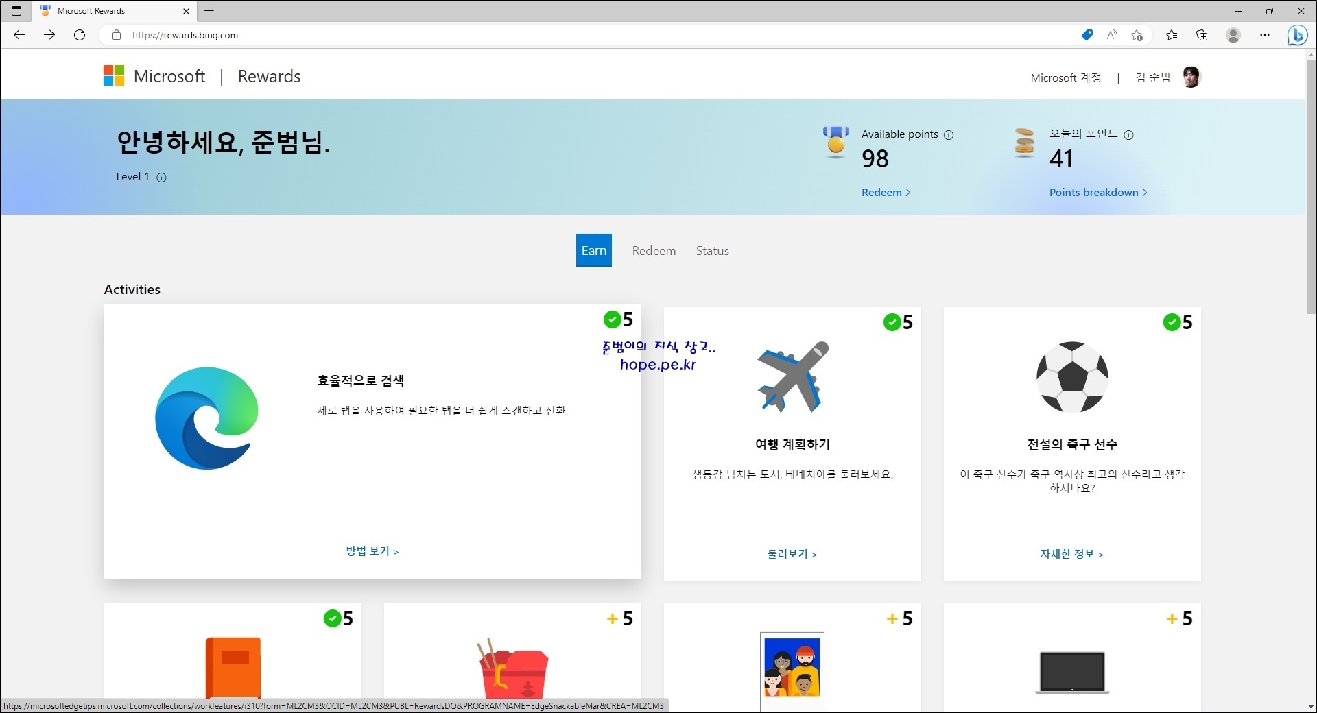 cf) Microsoft Rewards에 대해 정확하게 인지 하지 못한 상태에서, 단지 Edge 브라우저를 사용했을뿐인데.. 98포인트가 적립되어 있었습니다.
