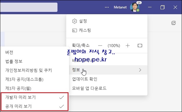 'Teams 설정 > 정보' 메뉴에 '개발자 미리 보기'와 '공개 미리 보기'에 체크가 되여 있음을 확인할 수 있습니다.